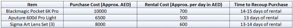 Think about this from another angle: you are a freelance videographer in Dubai hired for a two-day corporate shoot, where the client requires a cinematic look, which requires investing in high-end cameras such as the Blackmagic Pocket Cinema Camera 6K Pro body (about AED 10,000); lenses, batteries and media bring this investment up to around AED 15,000 to AED 20,000 when totaled up. Now consider renting. Renting a top-of-the-line video production camera costs approximately AED 500-800 per day and remains significantly less expensive than purchasing the equipment outright. Even for weeklong projects, this remains significantly less than purchasing
