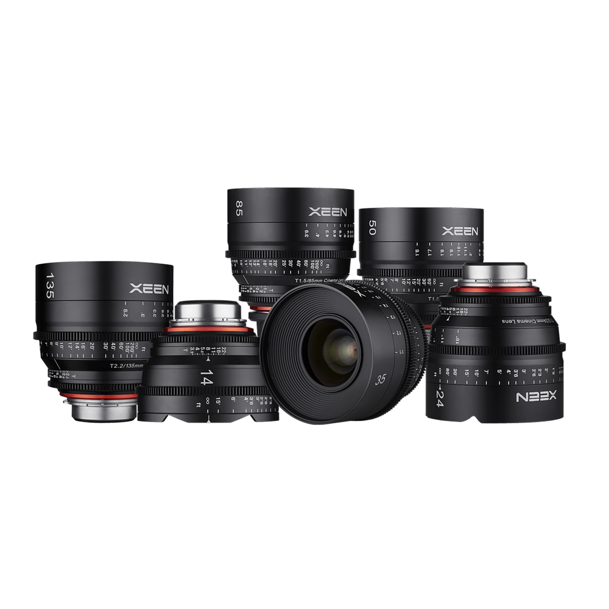 Complete set of six professional cinema lenses (16/24/35/50/85/135mm) featuring consistent T-stops, color matching, and superior optical performance for professional cinematography.